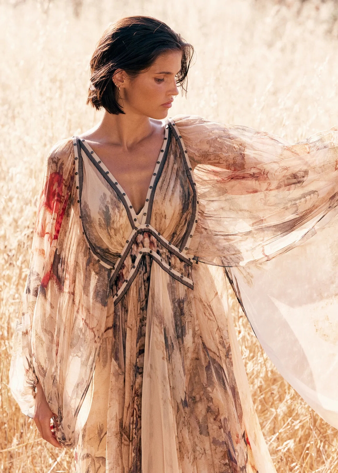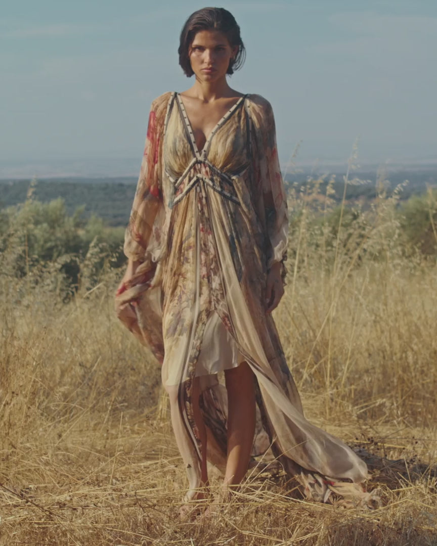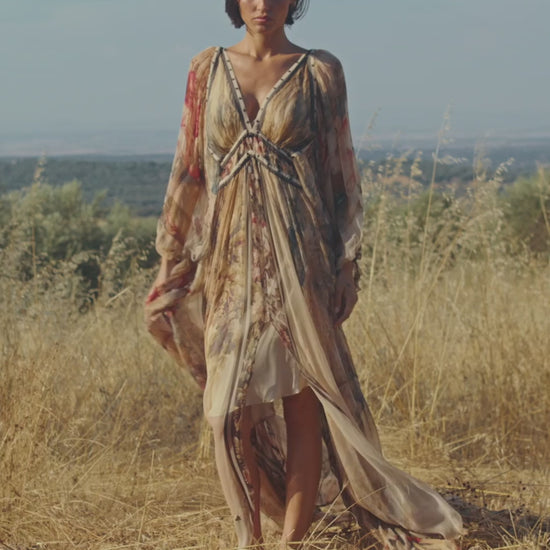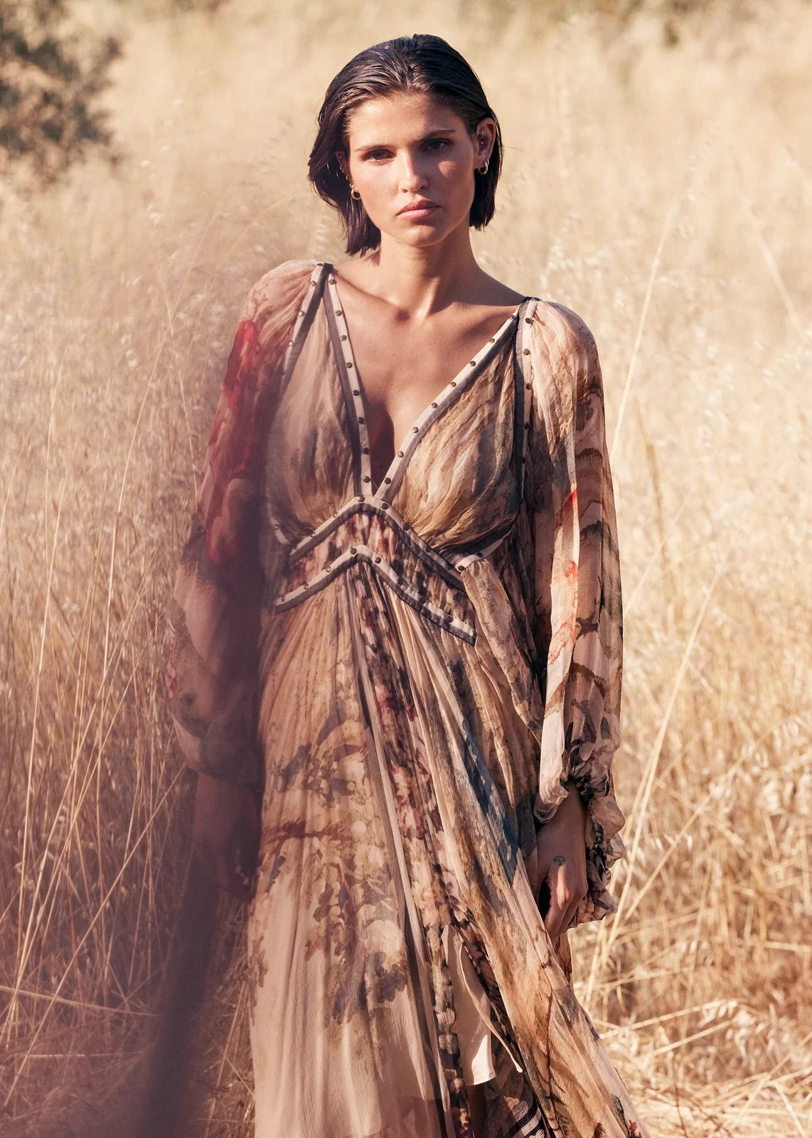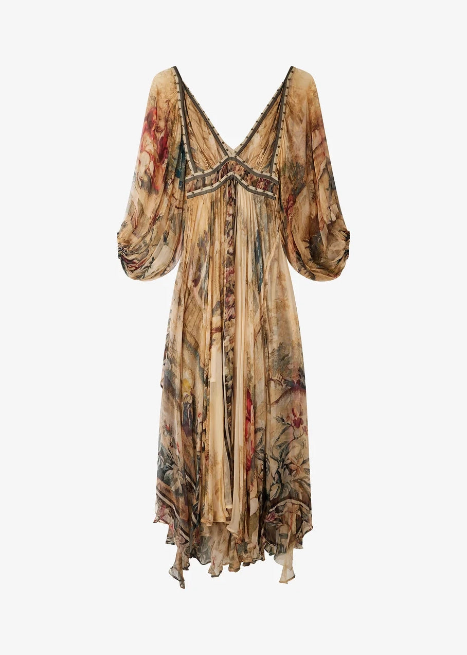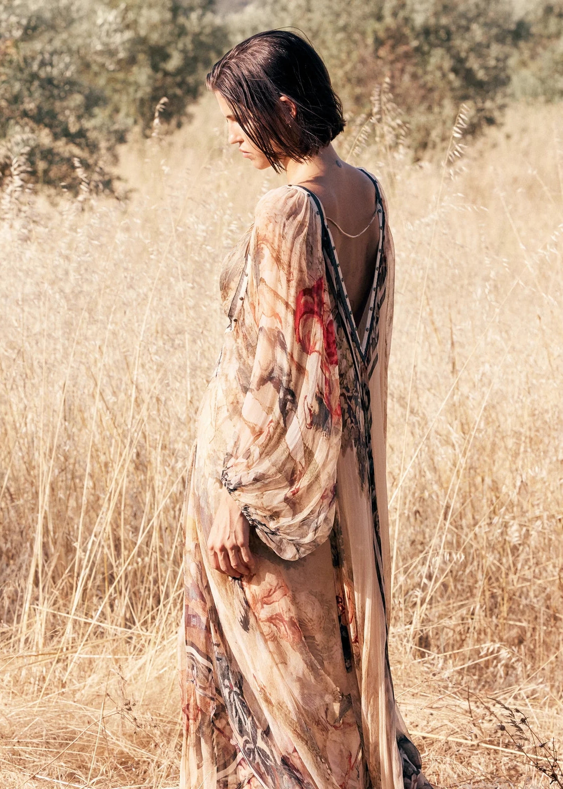 Questo lungo abito in chiffon di viscosa presenta una stampa barocca su sfondo écru, come un dipinto in movimento.