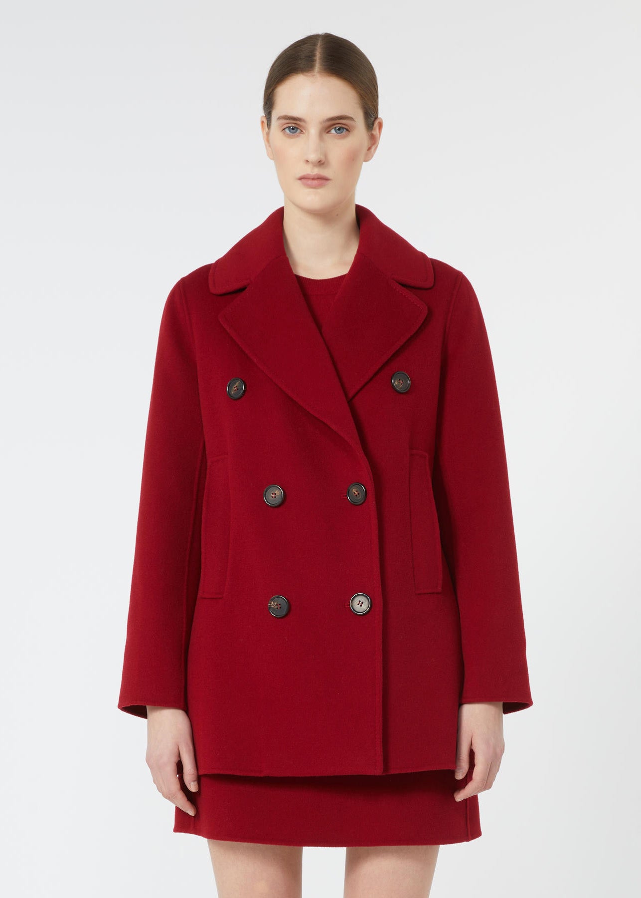 Cappotto caban doppiopetto lungo al primo fianco, dalla linea leggermente svasata.