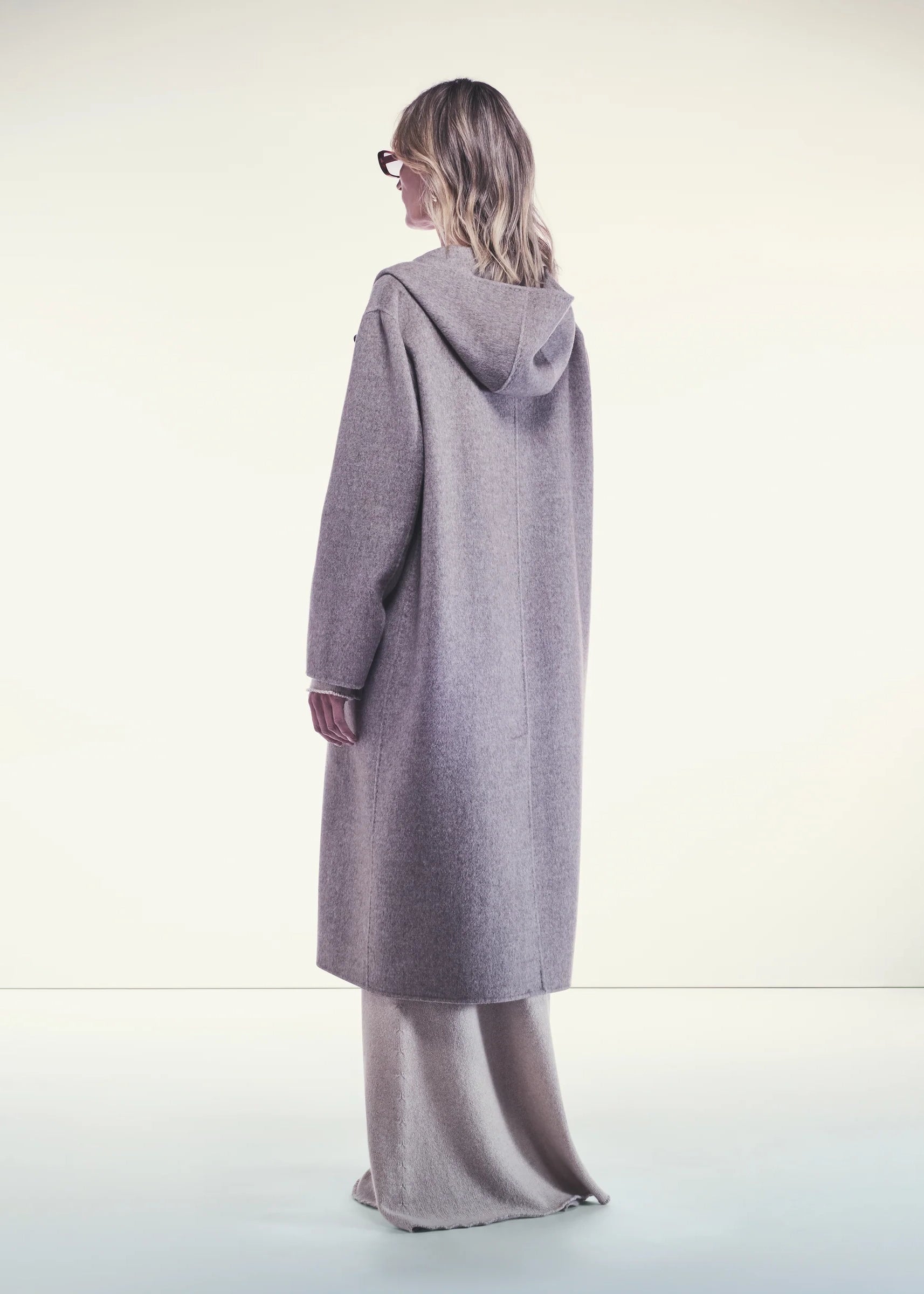 CAPPOTTO LUNGO IN PANNO LANA E YAK, CON CAPPUCCIO, LINEA DRITTA E TASCHE APPLICATE. CHIUSURA CON BOTTONI, MORBIDO E CALDO.