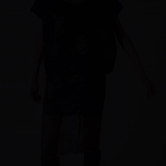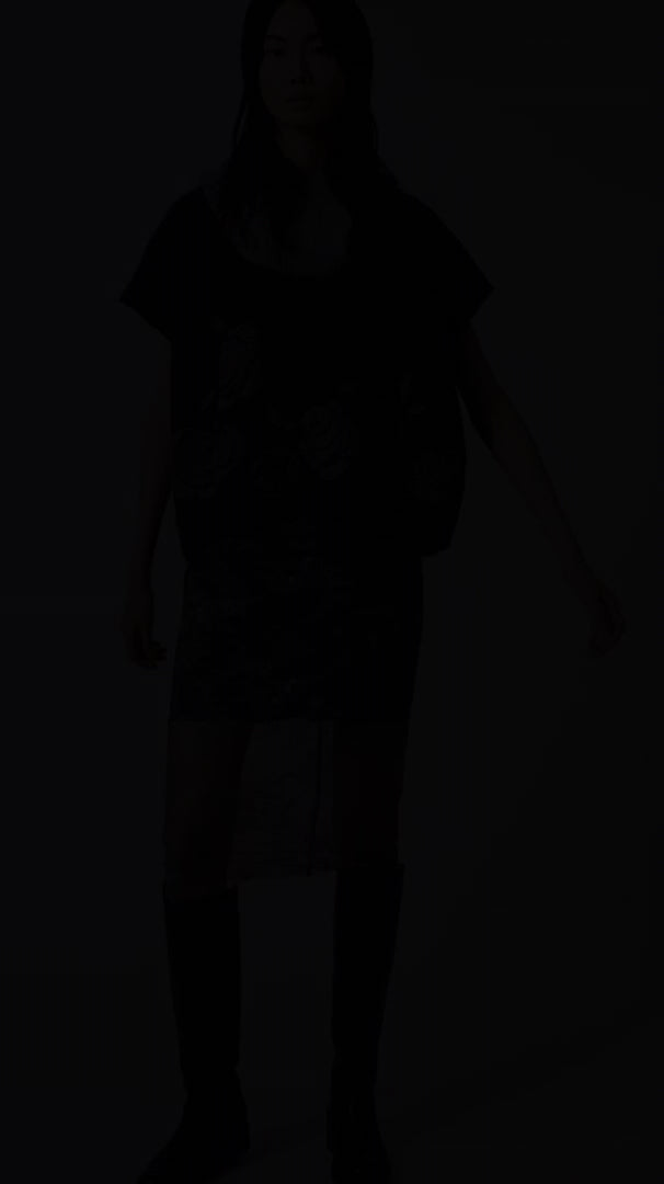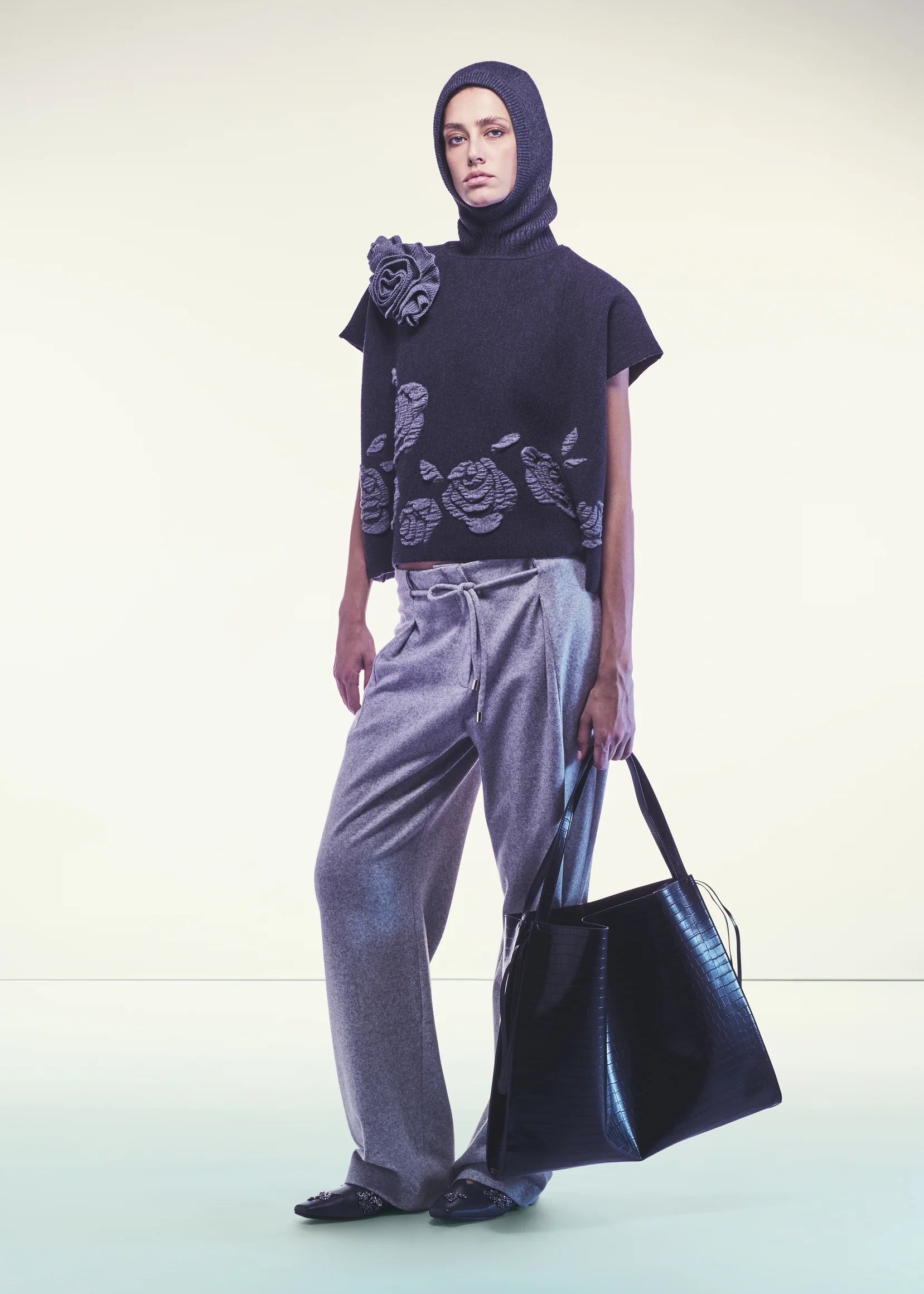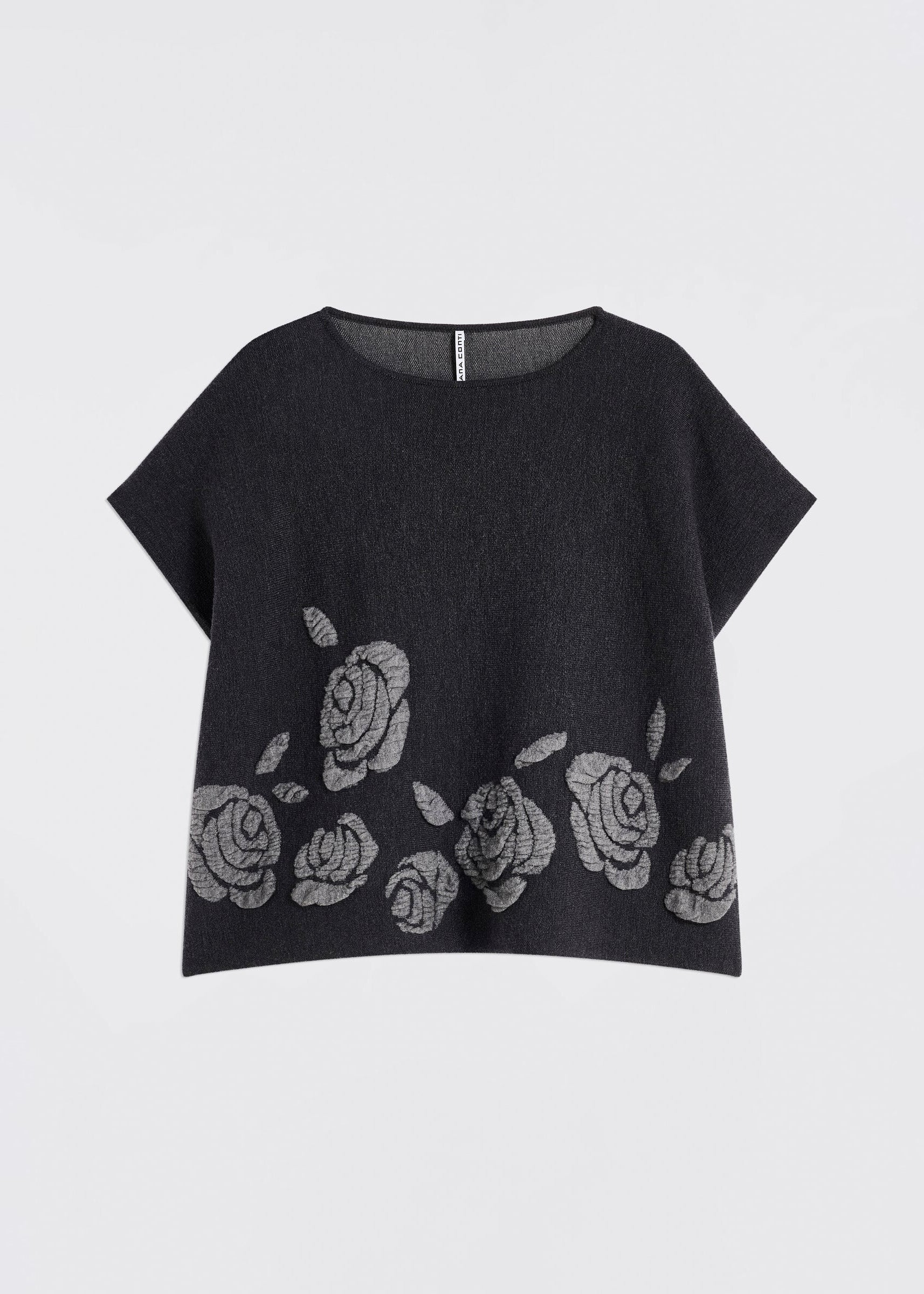 MAGLIA A MANICHE CORTE IN LANA INFELTRITA, LUNGA FINO ALLA VITA. MOTIVO ROSA JACQUARD TONO SU TONO SU TUTTE LE VARIANTI. ROSA VOLANT NON INCLUSA. LINEA LEGGERMENTE OVER.