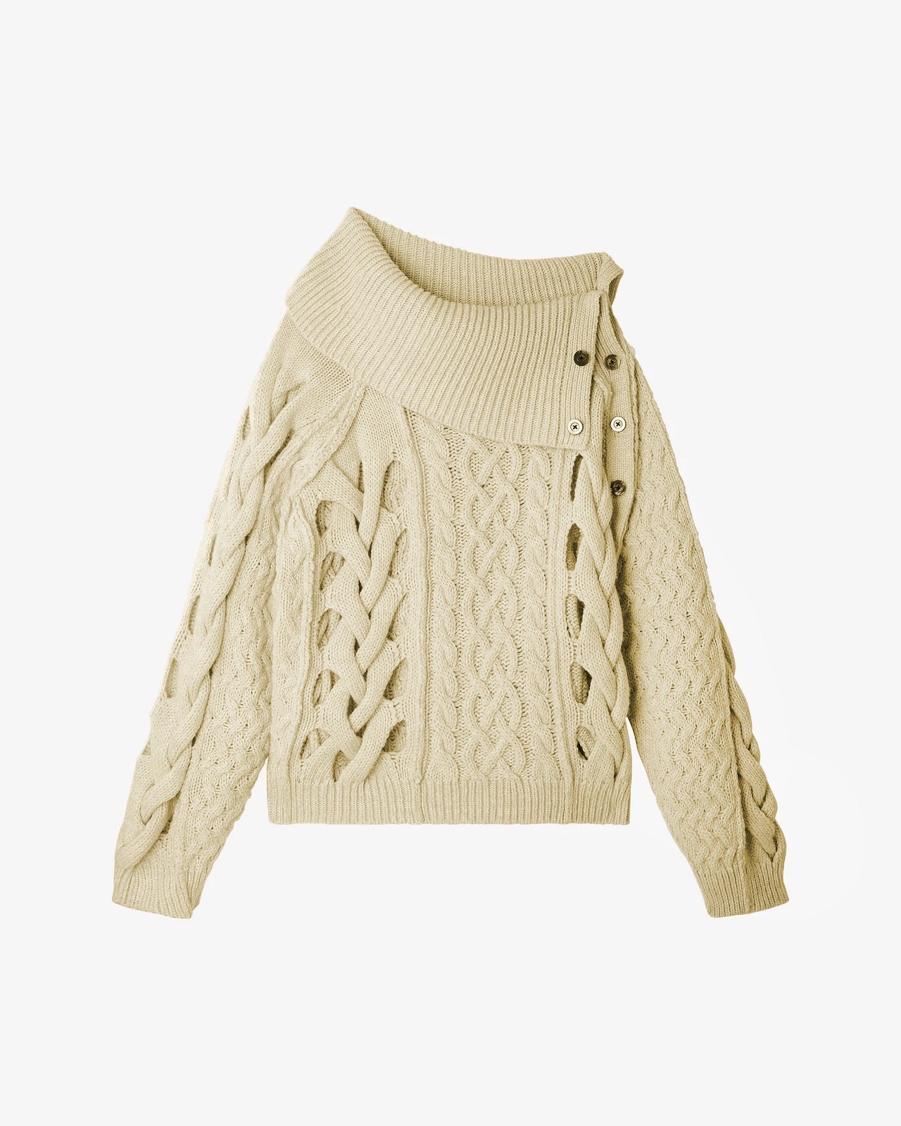 Maglione in maglia grossa grigio mélange, caratterizzato da un ampio motivo a trecce traforate che aggiunge volume e texture. Maniche raglan per un comfort ottimale e una silhouette rilassata. L'ampio colletto button-down sul lato può essere regolato per rivelare delicatamente una spalla, aggiungendo un tocco sobriamente sensuale. Ideale per un look comodo ma elegante.