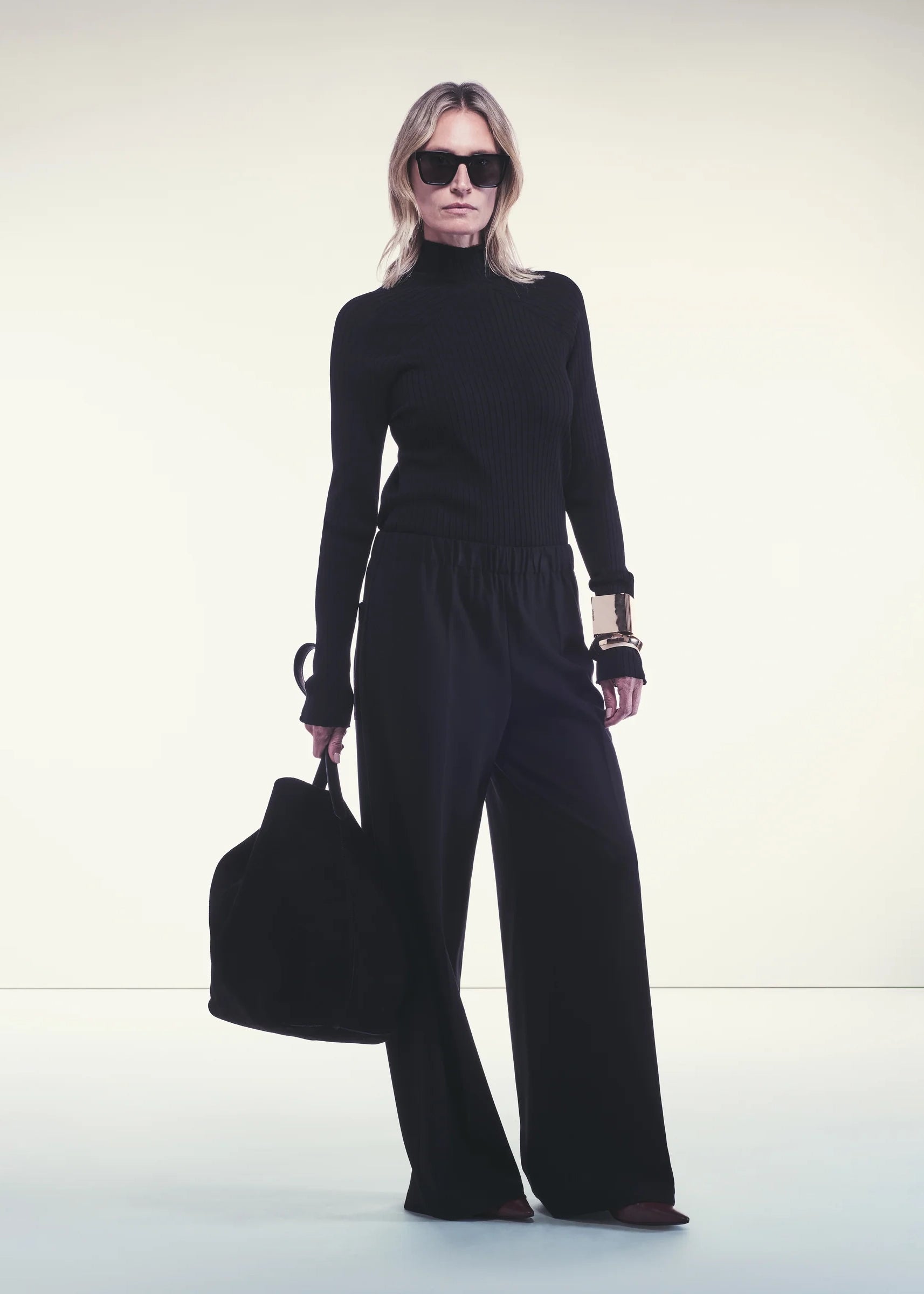 PANTALONE PALAZZO IN PUNTO MILANO, AMPIO E FLUIDO. VITA ALTA CON FASCIA ELASTICA. LUNGHEZZA A TUTTA GAMBA CON TASCHE APPLICATE SUL RETRO.