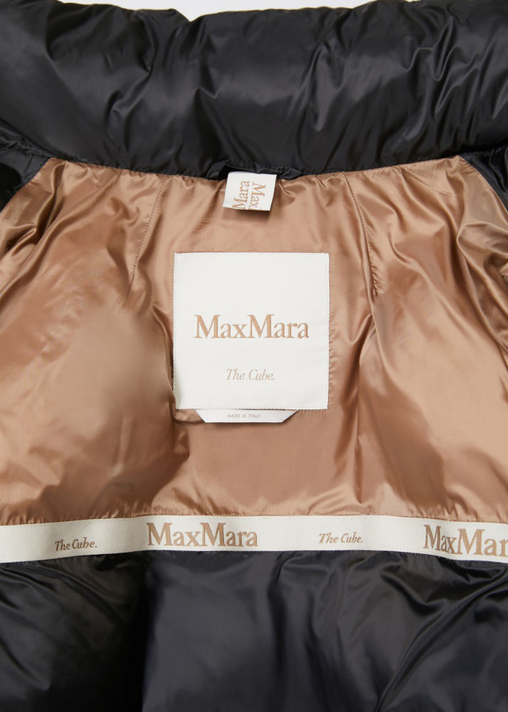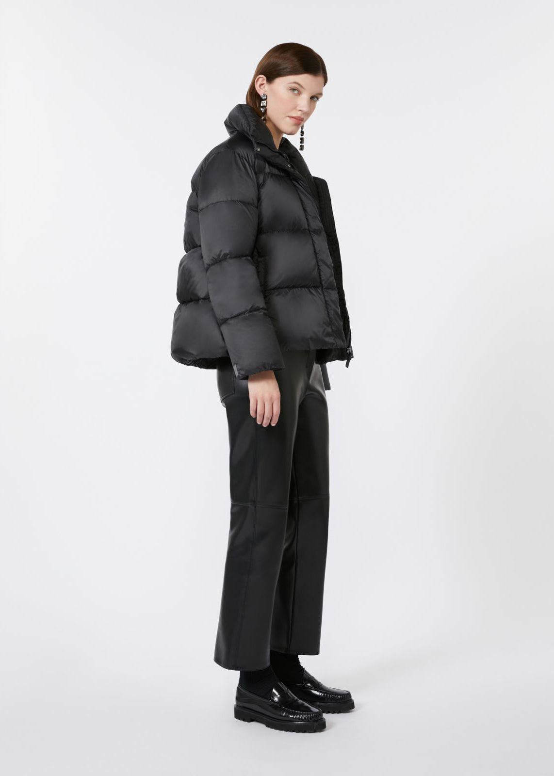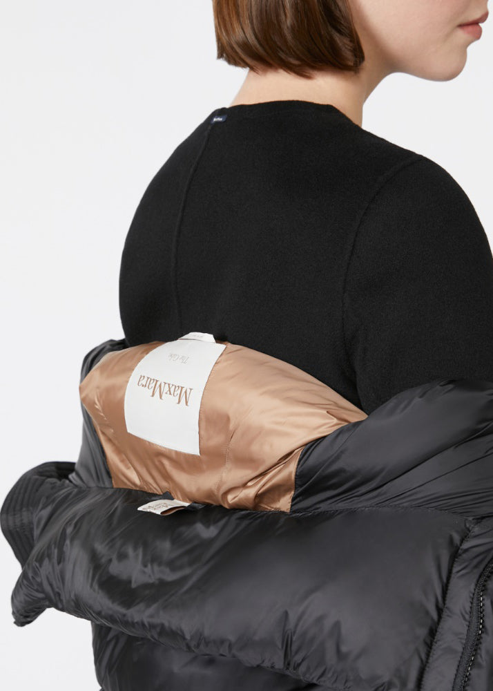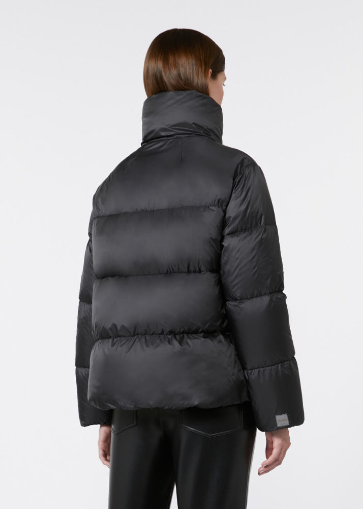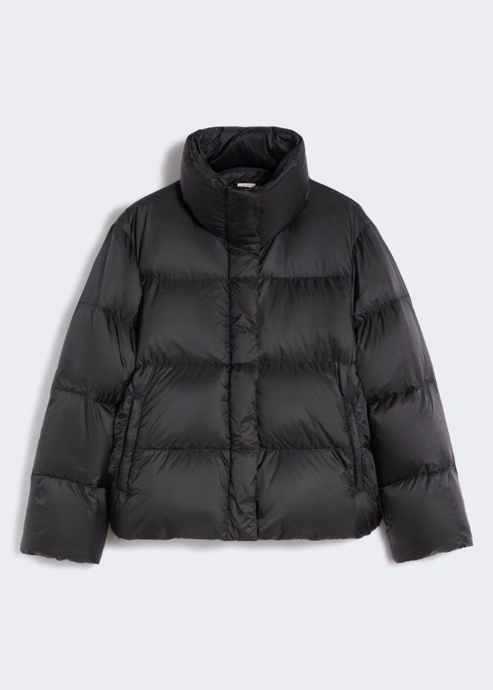 Piumino corto imbottito e trapuntato con collo alto e sprone interno personalizzato e nastro jacquard.