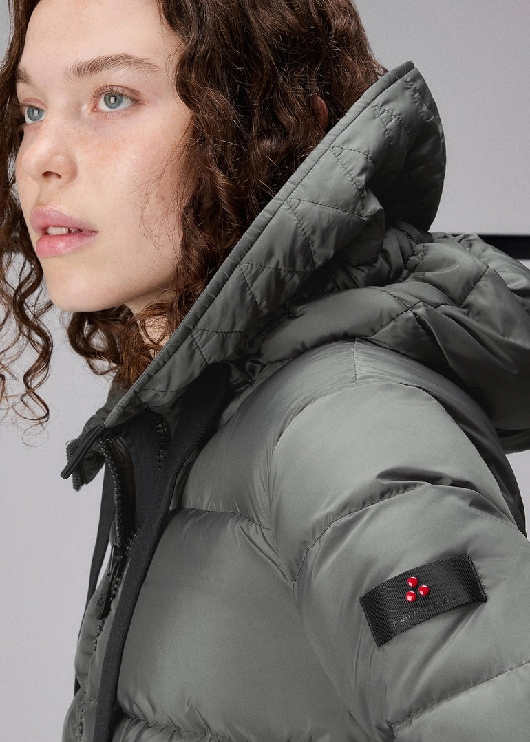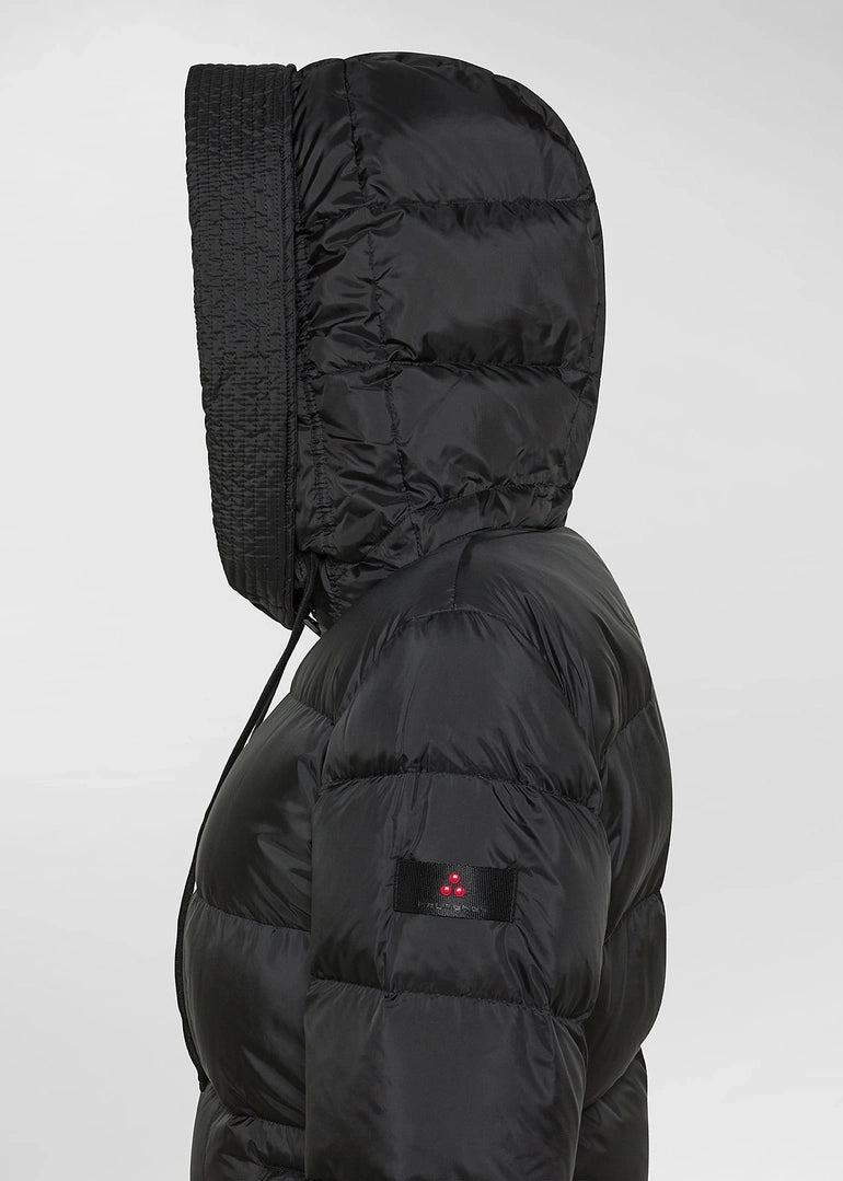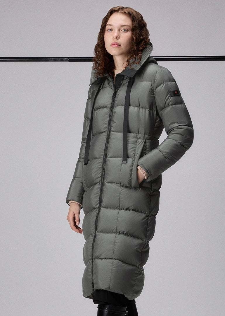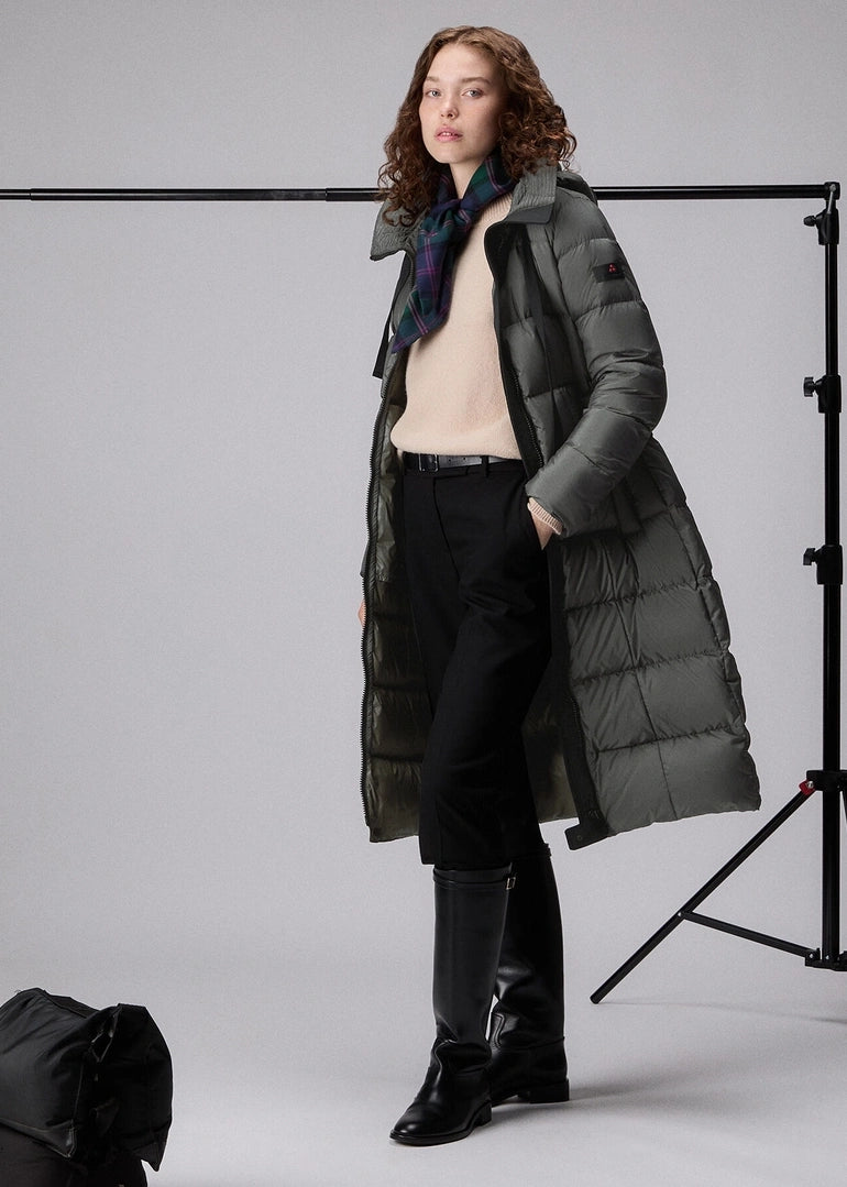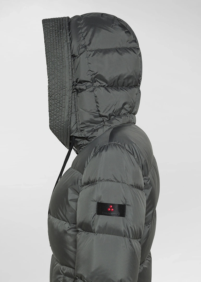 Piumino lungo ad ampie trapunte orizzontali, realizzato in tessuto super-light 100% poliestere riciclato post consumo, dalla mano morbida, finitura semi-opaca e struttura ultra compatta. L’imbottitura in piuma naturale certificata assicura un calore elevato senza appesantire. I dettagli tecnici - collo alto, cappuccio fisso regolabile, chiusura con zip a doppio cursore e ampie tasche laterali – ne esaltano la praticità. Il trattamento idrorepellente PFC Free protegge dalla pioggia leggera senza l’utilizzo di sostanze chimiche dannose. Ideale per chi apprezza la comodità senza rinunciare all’eleganza.