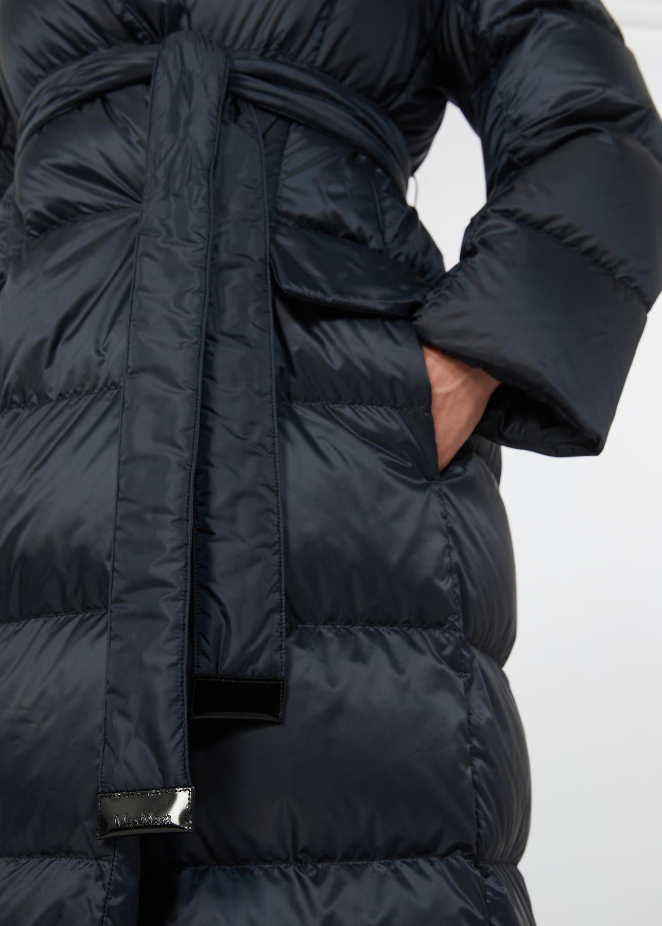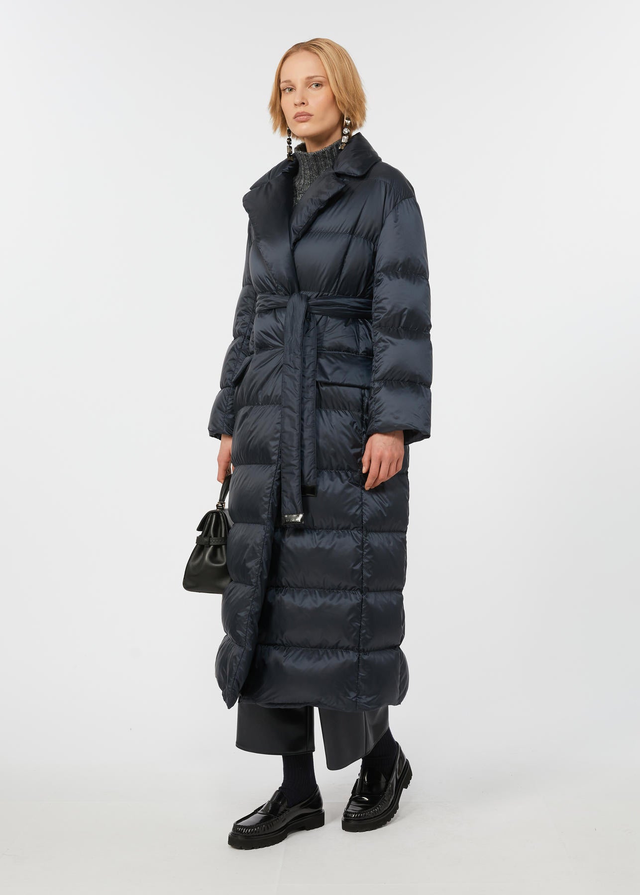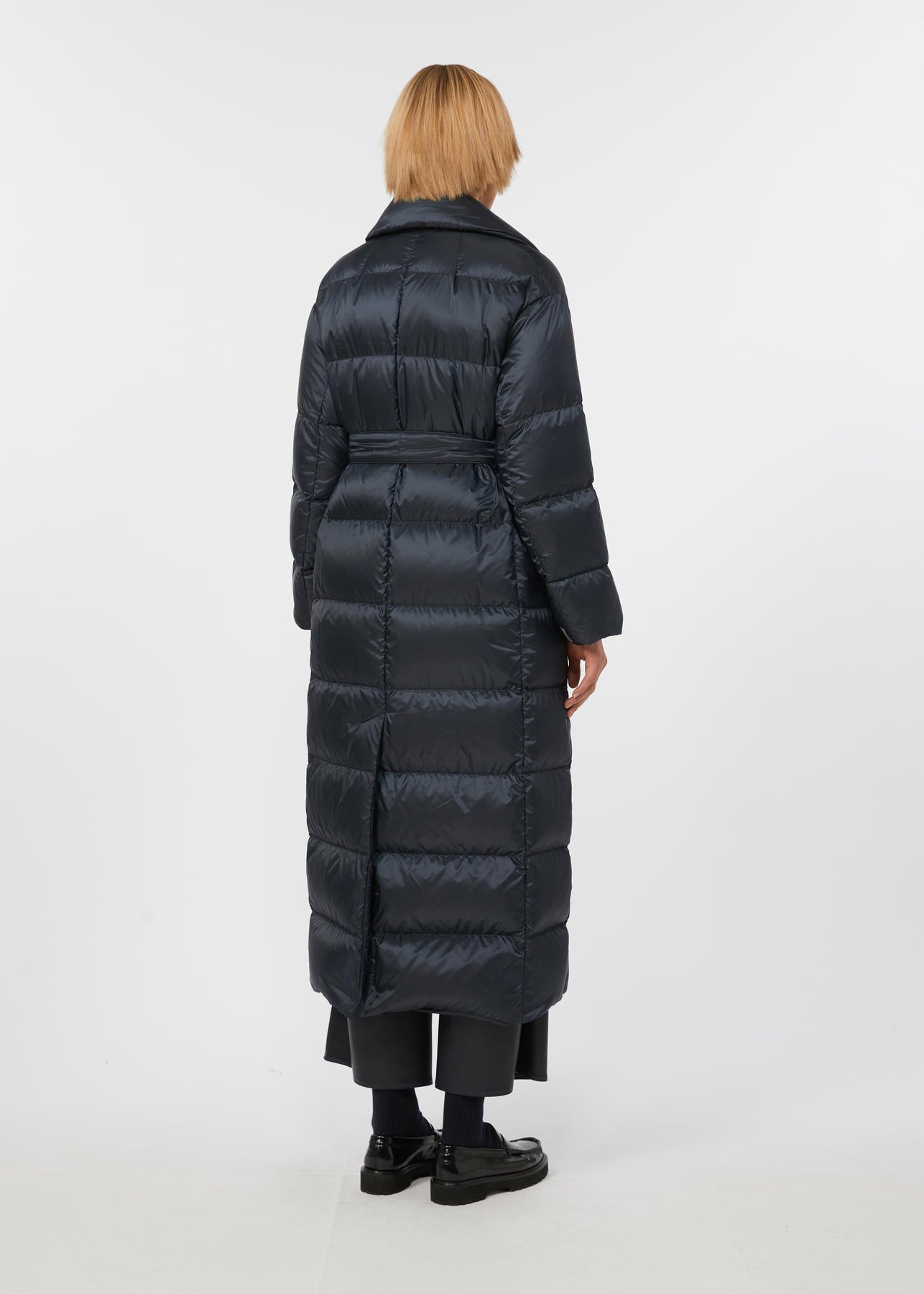Cappotto doppiopetto in tela tecnica antigoccia, imbottito e trapuntato. Collo con rever, maniche lunghe, tasche con patta, spacco sul retro. Chiusura con bottoni e cintura. Linea dritta.