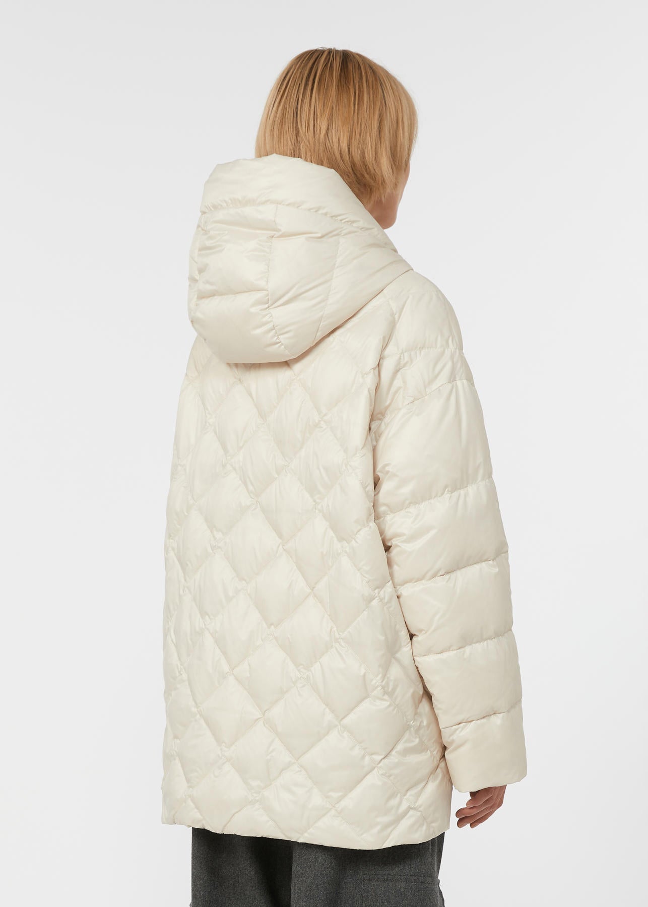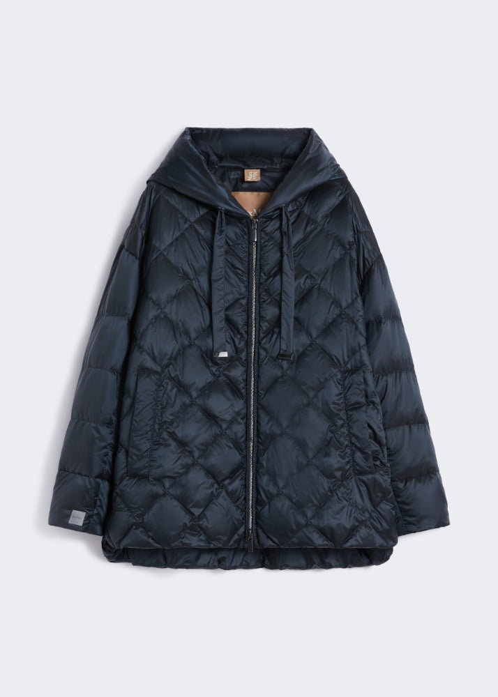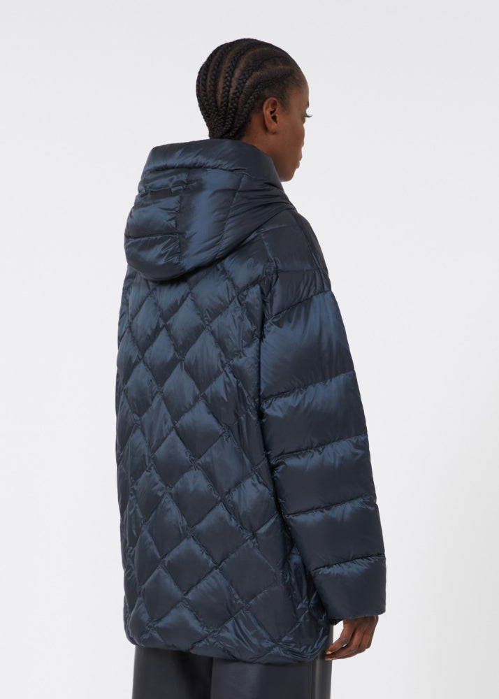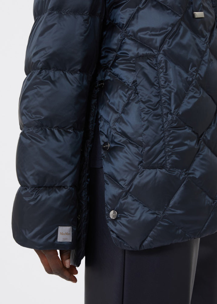 Giacca imbottita con trapuntatura a rombi sul fusto, davanti e dietro, e a righe su collo e maniche.