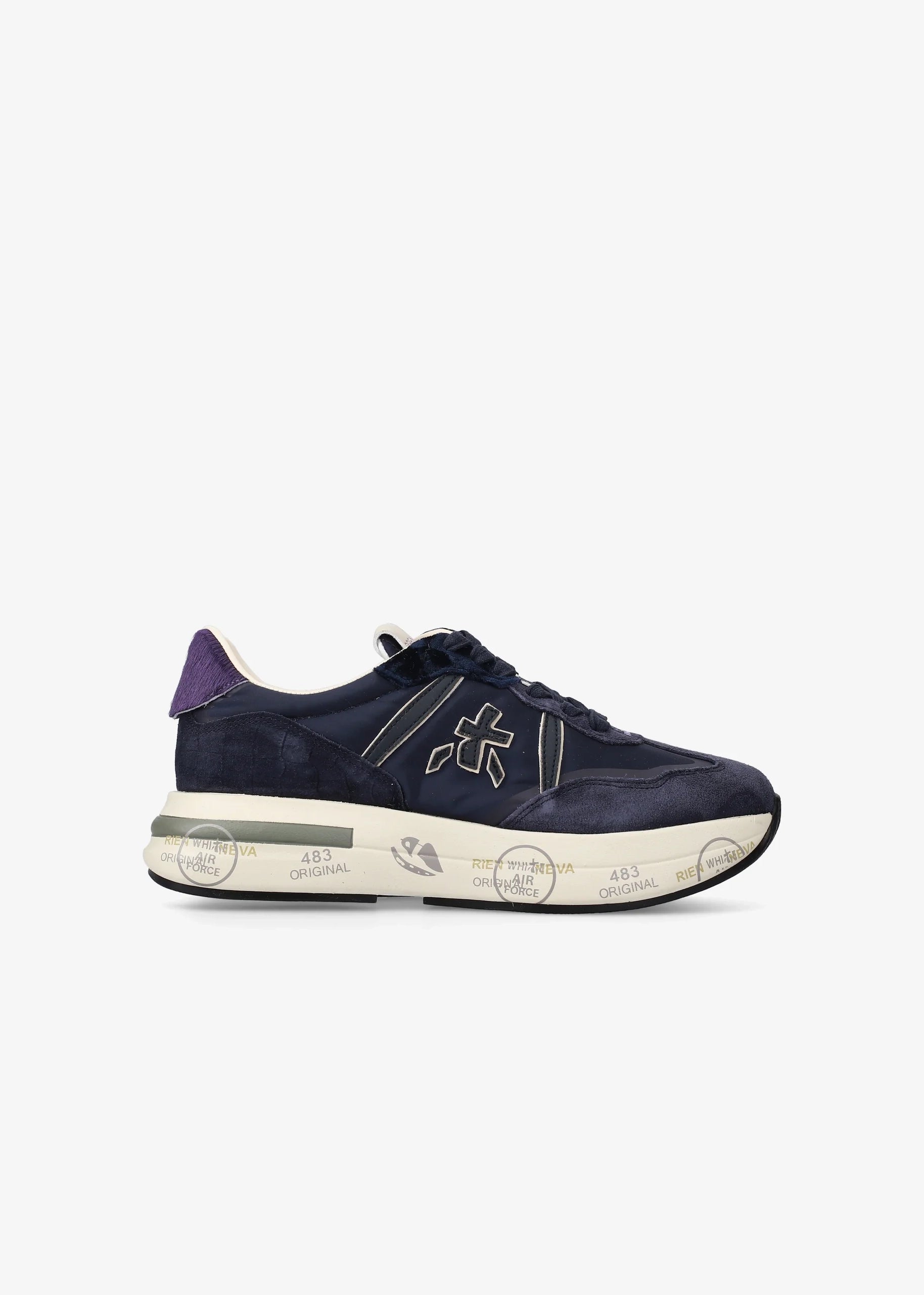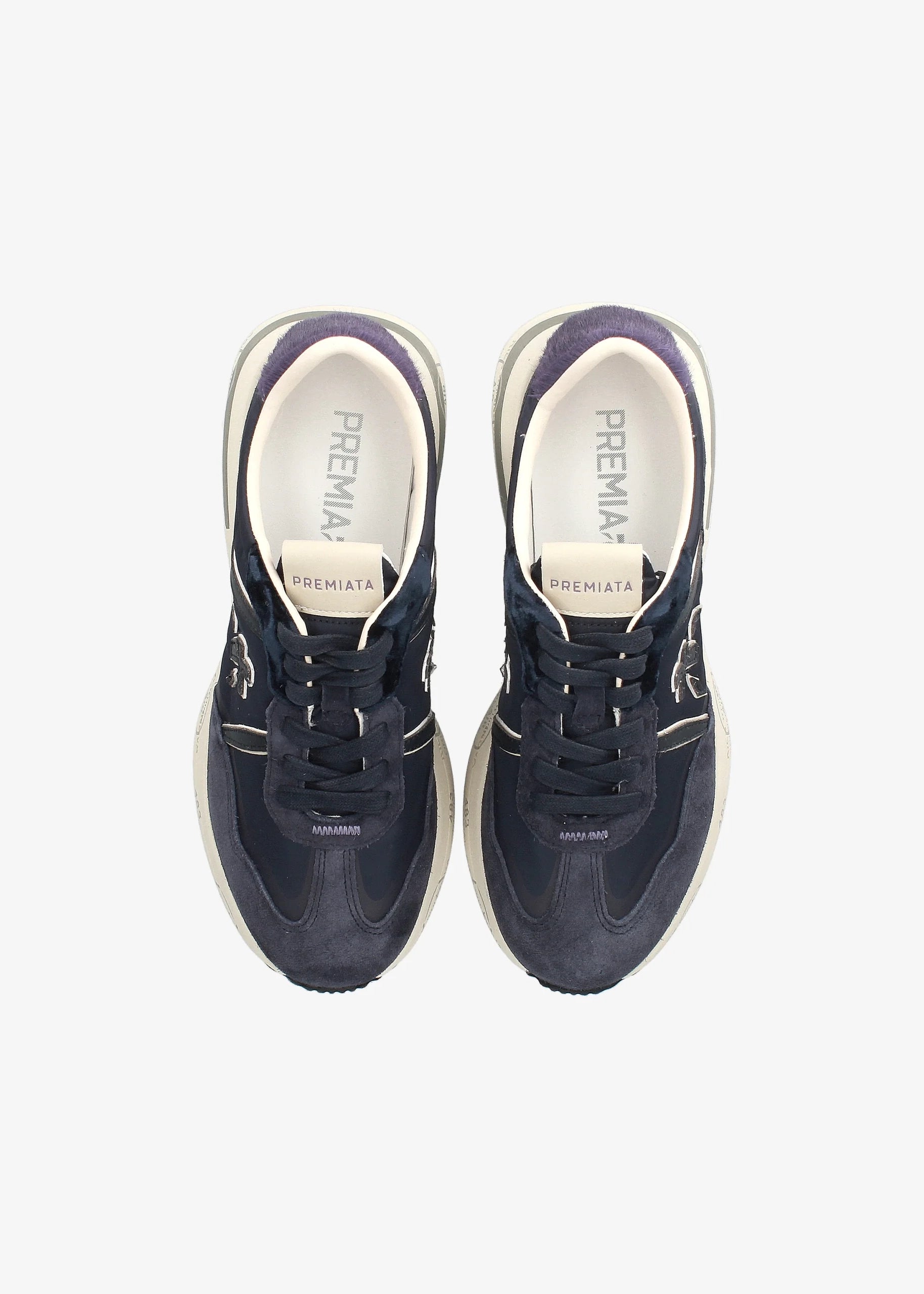 Sneaker Premiata in tessuto e pelle scamosciata blu scuro con logo e dettagli bianchi sul lato. Suola chiara con timbri caratteristici del brand. Perfetta per un look casual e moderno.