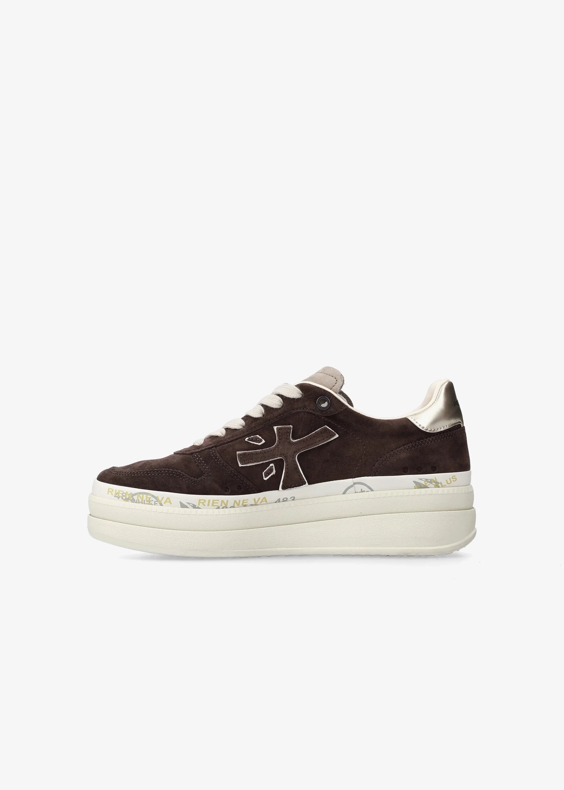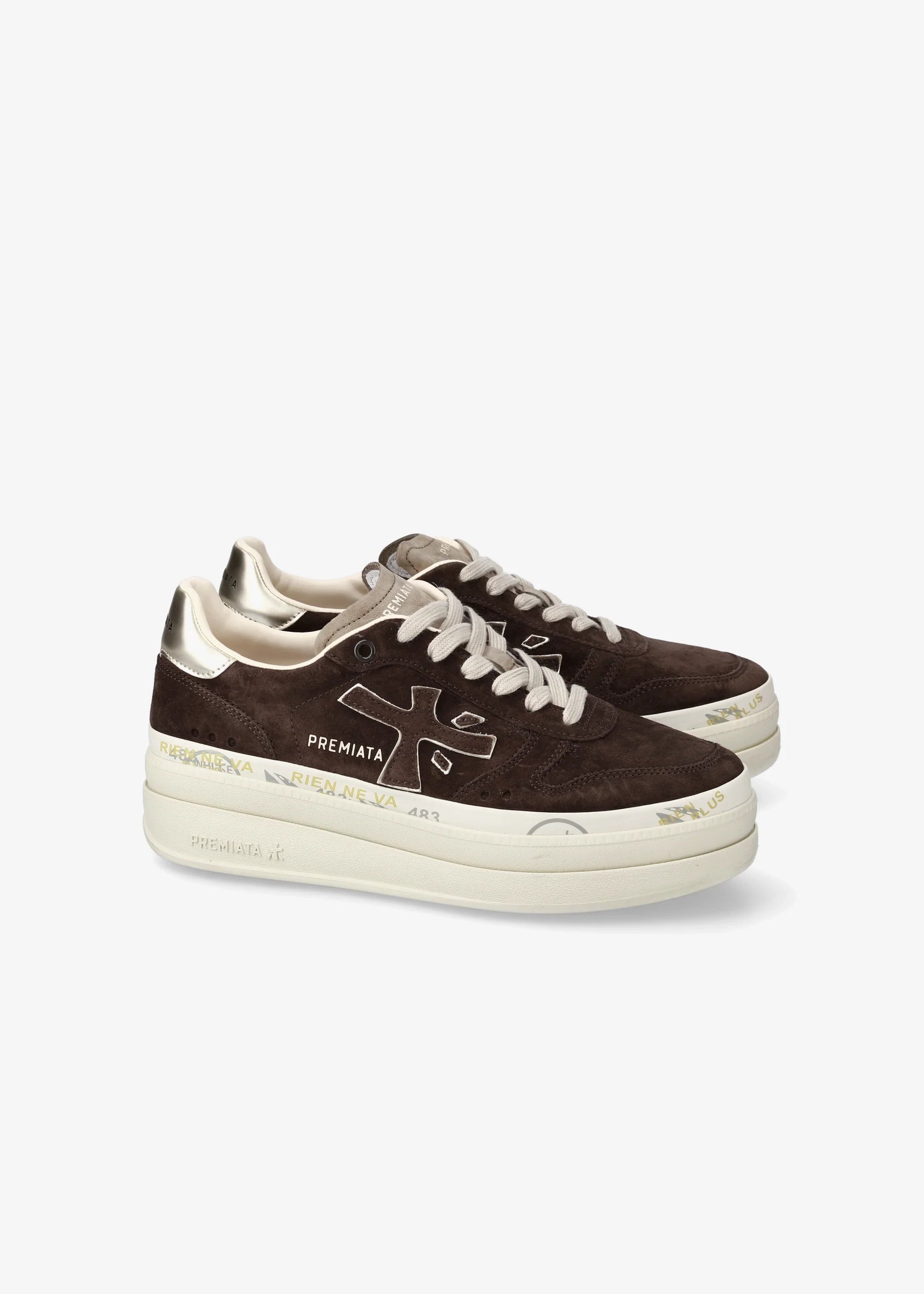 Tra i nuovi must have di Premiata. Lo stile raggiunge nuove vette, unendo design come la suola platform doppio strato con un’intersuola impreziosita dagli iconici timbri del brand.