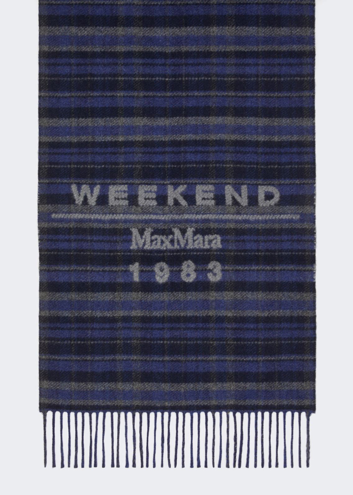 Stola personalizzata con disegno jacquard e lettering Weekend Max Mara 1983 sul fondo.